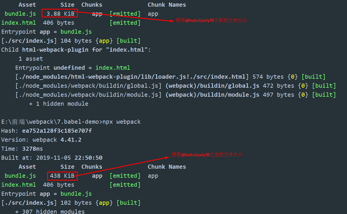 }重新打包发现bundle.js文件大小回到跟没使用@babel/polyfill时一样