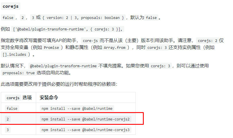 根据官方文档,我们配置了corejs: 2, 因此必须安装依赖npm install --save @babel/runtime-corejs2