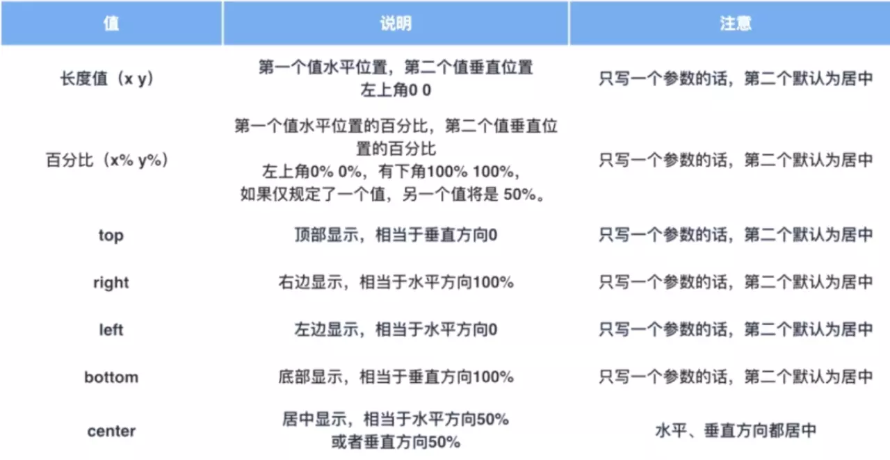 语法: background-position: 百分比 | 值 | top | right | bottom | left | center