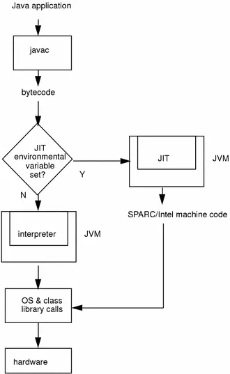在 HotSpot 里面,上述翻译过程有两种形式:第一种是解释执行(interpreter),即逐条将字节码翻译成机器码并执行;第二种是即时编译(Just-In-Time compilation,JIT),即将一个方法中包含的所有字节码编译成机器码后再执行。