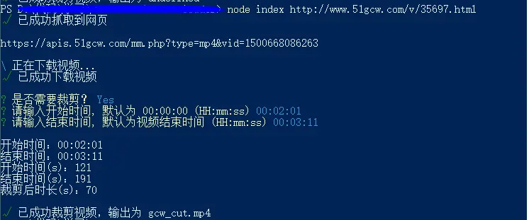 - 视频下载完成后,在命令行提示输入 开始时间、结束时间,输入完成后开始剪辑视频