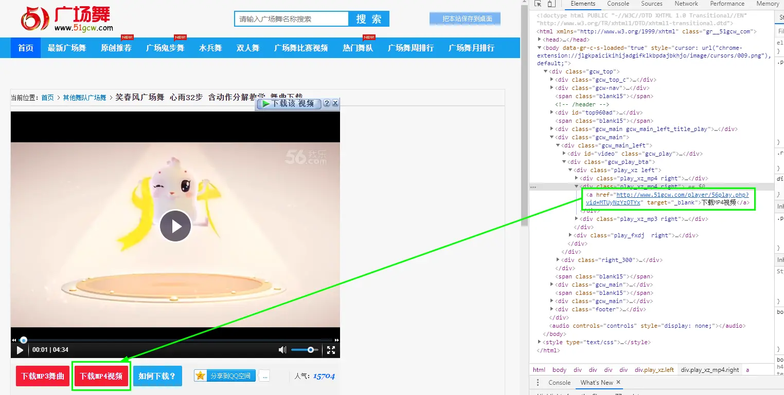 随便打开一个 51广场舞 的视频,发现页面就有提供下载按钮,用开发者工具看一下,可以看到按钮的 href 就是视频请求 URL,这就好办了,这里要注意下,这个 URL 不是我们在命令行输入的那个,我们输入的是顶部链接栏的 URL ,这个是我们爬取的目标,是视频的下载链接!