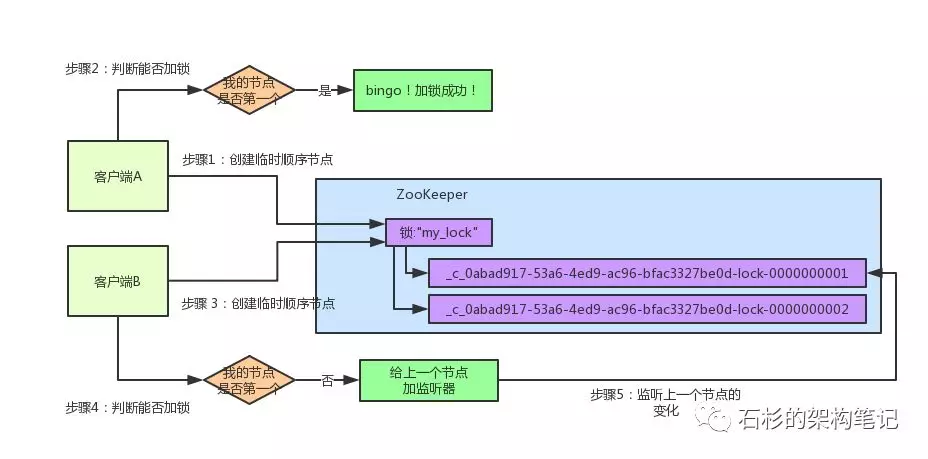 删除最小节点后客户端会通过监听器收到通知,然后再次判断是否自己的节点最小,是的话进行加锁,不是的话重复上述操作。