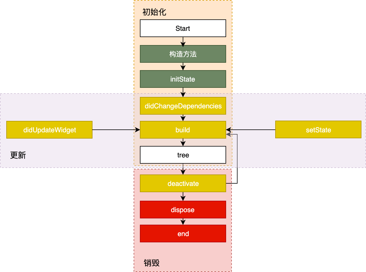 一旦这三个方法被调用,Flutter 随后就会销毁老 Widget,并调用 build 方法重建 Widget。