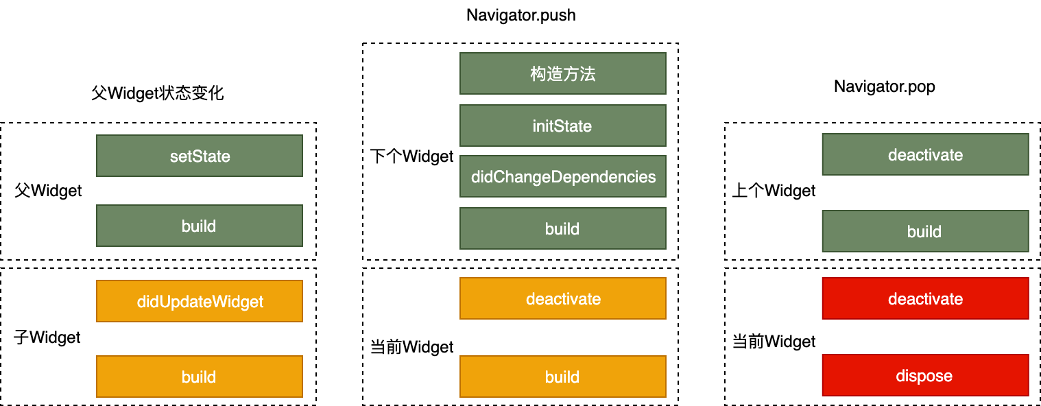 - 当组件的可见状态发生变化时,deactivate 函数会被调用,这时 State 会被暂时从视图树中移除。值得注意的是,页面切换时,由于 State 对象在视图树中的位置发生了变化,需要先暂时移除后再重新添加,重新触发组件构建,因此这个函数也会被调用。