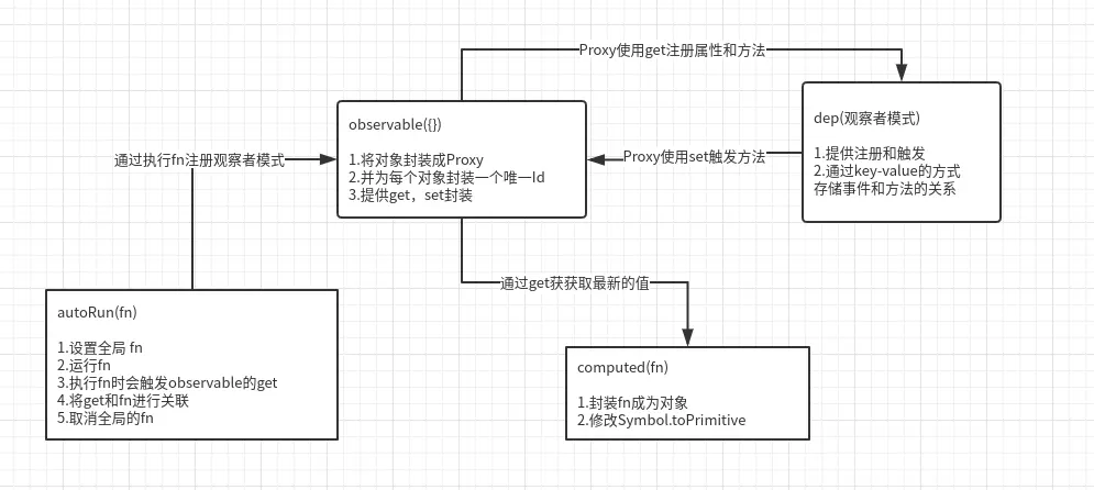 在执行 autoRun 的 fn 的时候,就会触发到 Proxy 里的各个属性的 get 方法,这时候通过全局的变量将属性和方法进行映射。