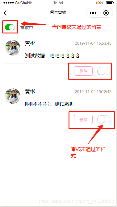 }上面代码对应实例如下:1.查询未通过审核的留言;2.查询全部的留言
