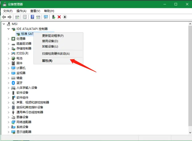 如图所示:右键点击 主机名 -> IDE ATA/ATAPI 控制器 -> (可能是英文 AHCI, 也可能是 PCI-XXX,根据您的电脑情况试),点击属性