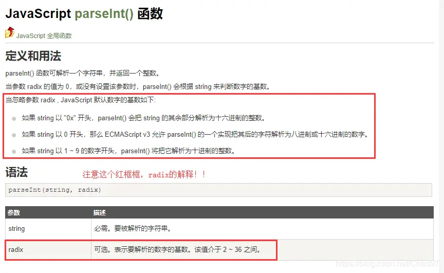 - parseInt('2', 1):radix的值为1,如果该参数小于 2 或者大于 36,则 parseInt() 将返回 NaN。