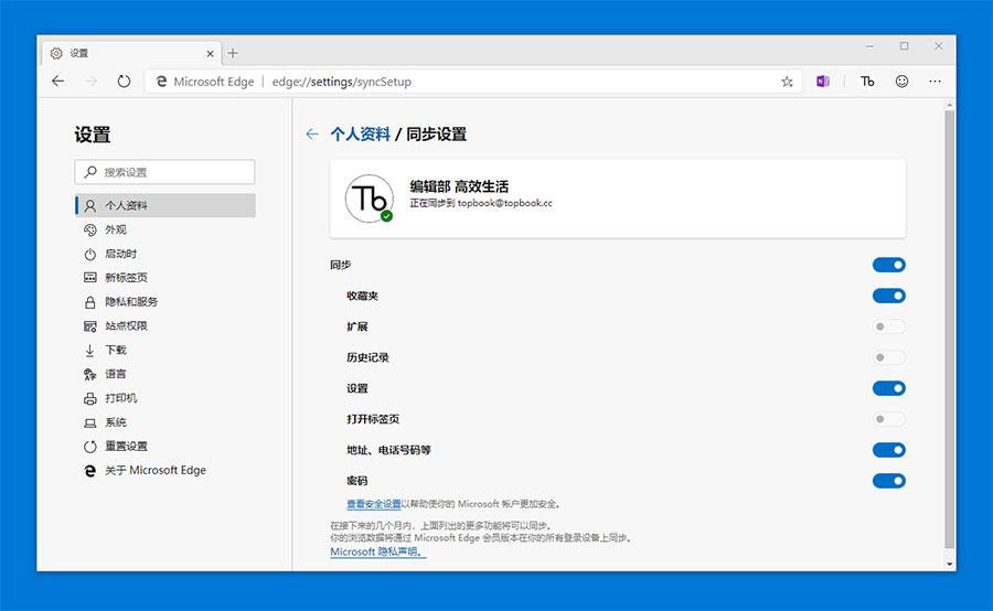 在主页右上角,你可以通过设置图标,切换页面布局。你可以登录自己的微软账户,方便在不同设备同步内容。点击三个点-【设置】-【个人资料】,你就可以看到同步选项,可以同步收藏夹、扩展、历史记录、标签页等等。但目前在 Beta 版本中有的同步选项是灰色。有兴趣可以在 Canary 版本中尝试。
