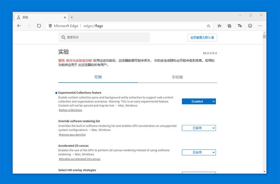 Canary 中的集锦功能需要自行手动开启,在地址栏输入 edge://flags/ 进入实验页面,找到 Experimental Collections feature,切换为 Enabled 就可以了。