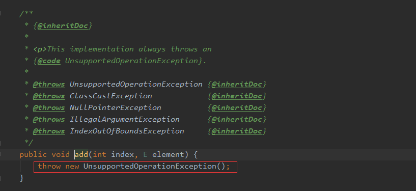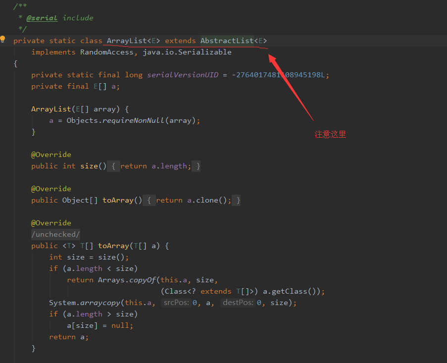 原来这个ArrayList并不是我们熟知的那个ArrayList,而是Arrays的一个内部类,它仅仅继承了AbstractList抽象类并重写了部分方法而已,当然,这部分方法并不包括add(),所以当我们调用add()时,会直接抛出unSuppostOption异常也就解释的通了!