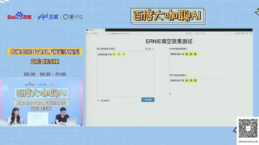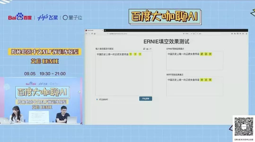 直播环节中,龙老师直接用填空题的形式展示了ERNIE与BERT在填空方面的表现。