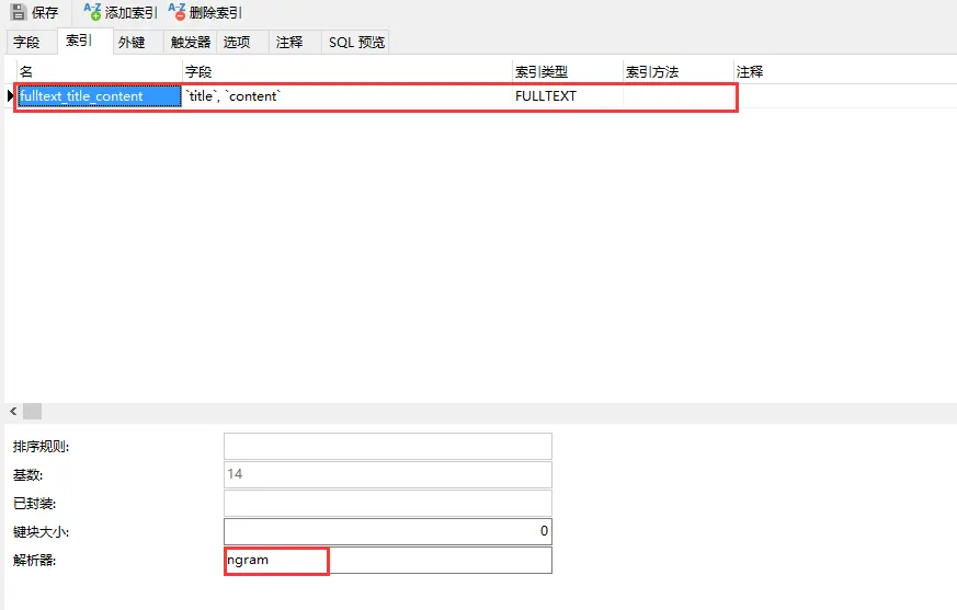 alter table `t_article` add fulltext index fulltext_title_content(`title`,`content`) WITH PARSER ngram;