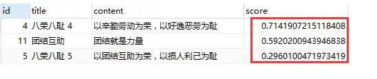 select *, MATCH (title, content) AGAINST ('团结劳动') as score