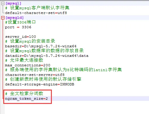 【方式2】 :在修改MySQL配置文件 my.ini 中,末尾增加一行 ngram_token_size 的参数设置: