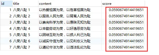 查询结果如下(可以看到,此处得分是一样的):