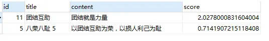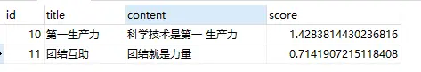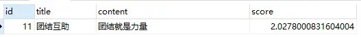 此时,再次执行上面的单个汉字“力”查询语句,结果如下(由于记录id = 10 中包含两个“力”,记录id = 11 中只有一个“力”。所以,查询结果中,前者得到的分数是后者的两倍):