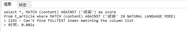 from t_article where MATCH (content) AGAINST ('诚实' IN NATURAL LANGUAGE MODE)
