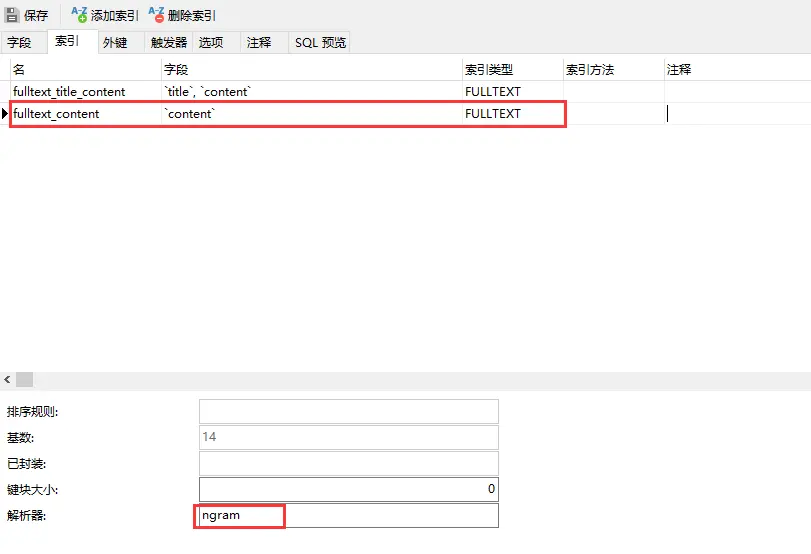 FULLTEXT INDEX `fulltext_title_content`(`title`, `content`) WITH PARSER `ngram`