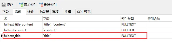 同理,如下需要单独对字段 title 进行全文检索,需要给字段 title 创建全文检索的索引,创建语句如下: