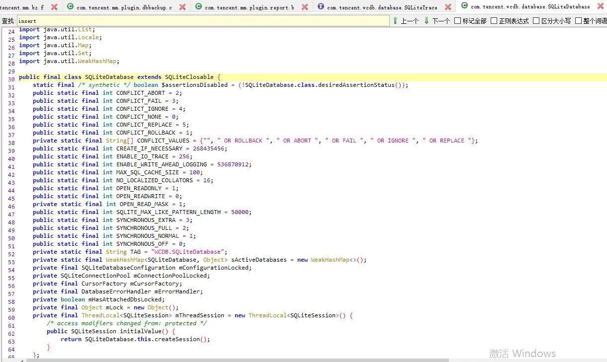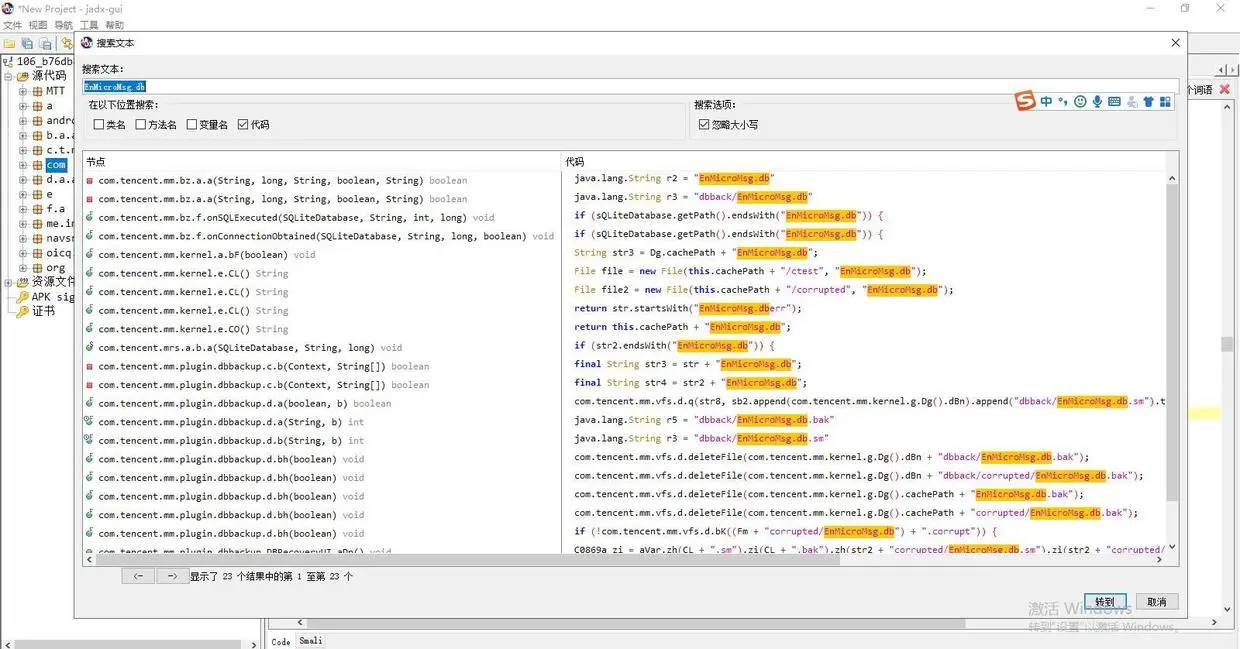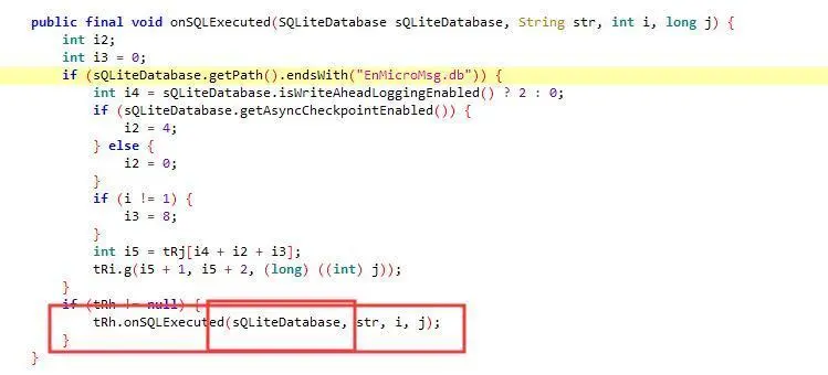 EnMicroMsg.db之后就要每个结果去分析看哪个是比较有“眼缘”的结果。我们可以看到,第三条名字是onSQLExecuted,嗯?有点像,跟进去看看。