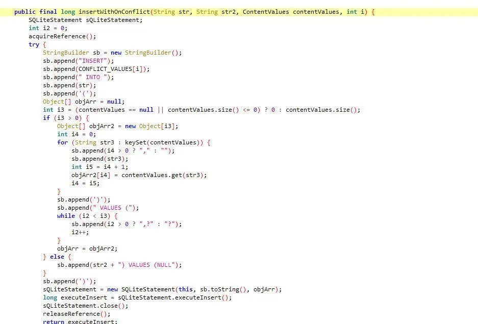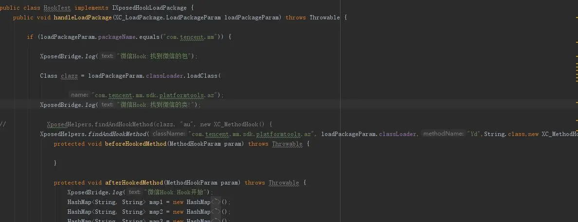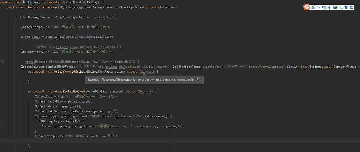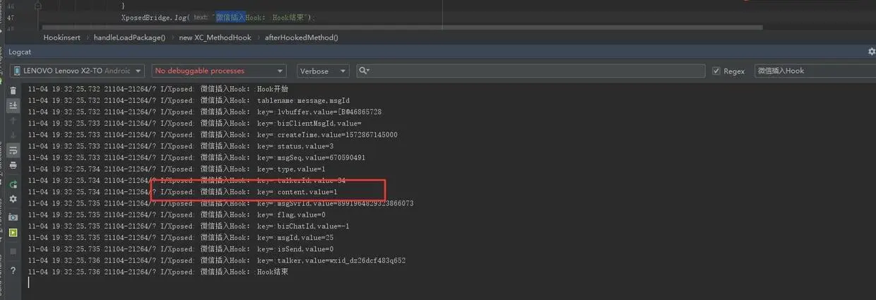 Sql语句拼接的过程,那么这个方法的参数应该是我们收到的消息的值,只要Hook这个方法,我们就可以去拿到插入数据库时的值了。