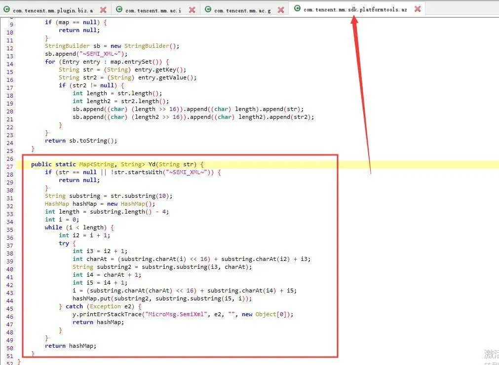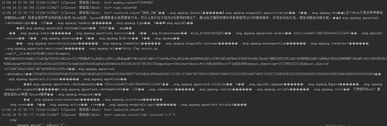 可以看到一大段代码,我们看到Reversed字段是由很多乱码和字段以及值组成的,那么我猜测微信内部实现了一个解码工具,如果我们能够Hook到这个解码工具,是不是就可以获取到解码之后的正确数据了呢?说到解码,根据微信以往的数据传输来看,这些数据很有可能是以XML的格式进行传输的,既然涉及到xml,那就一定是键值对的形式,我们去到的数据中除了有乱七八糟的小方块,还有诸如“.msg.appmsg.category.item”这类看起来有用的内容。