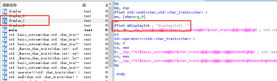 我们从上图中看到,对应在代码中的函数调用,转到汇编以后,call指令调用的函数名也是一样的。这和我们预想的结果有点不一样。但是有一点不一样,就是在call指令调用display时,括号内的东西不一样,那这里面的东西是什么呢?这其实是调用对应函数的内存地址,因此我们发现,在调用函数时,虽然看到call指令调用的函数名好像都是display,但是调用的地址却不一样,因此我们推断,调用的函数并不是同一个函数。