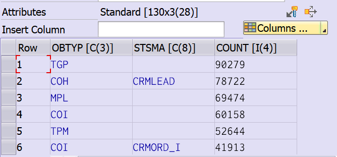 下图是Jerry完成的任务: 测试系统上内表一共有55多万行,其中有90279行,只维护了OBTYP为TGP,而没有维护STSMA. 排名第二的是COH和CRMLEAD的组合,出现了78722次。