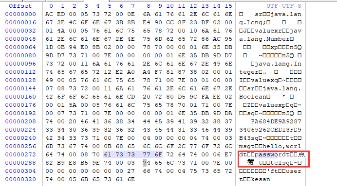 使用WinHex打开分析,如图所示为序列化之后得结果,主要是一大堆分隔符,以及类型信息和值,如图中红色方框标准的信息。
