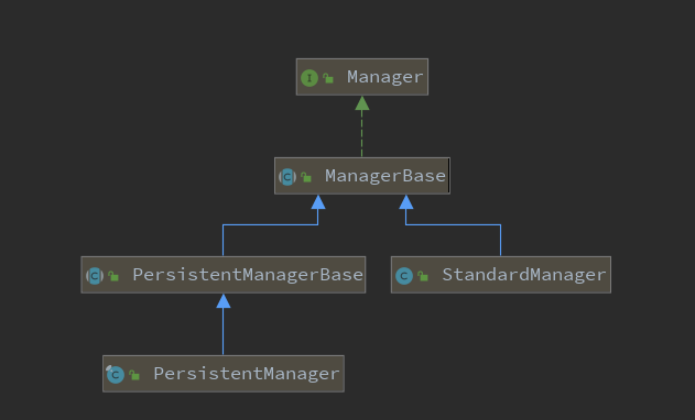 在创建StandardSession的时候都必须传入Manager对象以便与此StandardSession关联,因此我们可以将目光转移到Manager,而Manager与其子类之间的关系如下图所示。