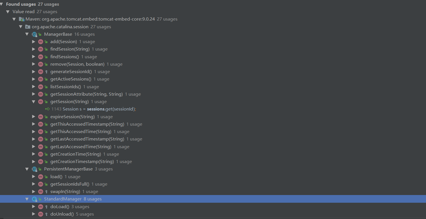 还记得上一节我们通过反射机制获取到了StandardSession吗?利用以下代码我们可以直接观察到反序列化出来的StandardSession是咋样的。