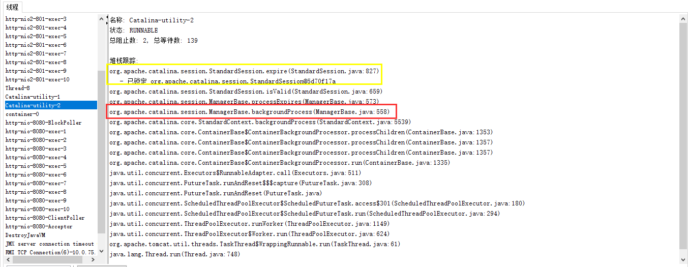 除了主动销毁之外,我们可以为session设置一个过期时间,当时间到达之后session会被后台线程主动销毁。我们可以为session设置一个比较短的过期时间,然后通过JConsole来追踪其调用栈,其是哪个对象哪个线程执行了销毁操作。