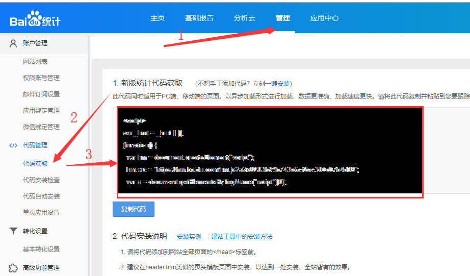 注册后进入管理内的代码管理 可以通过代码获取/一键安装 之后按照代码安装说明进行