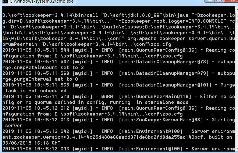 - 进入D:\soft\zookeeper-3.4.14\bin下,执行zkServer.cmd命令,相当于启动服务端