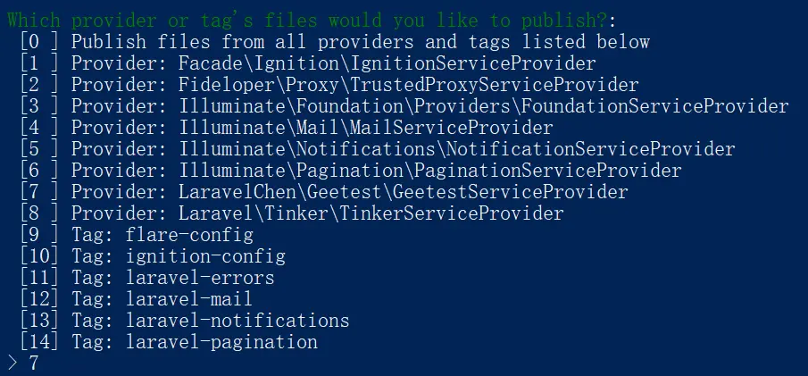 php artisan vendor:publish 出现下面的日志,输入7,回车