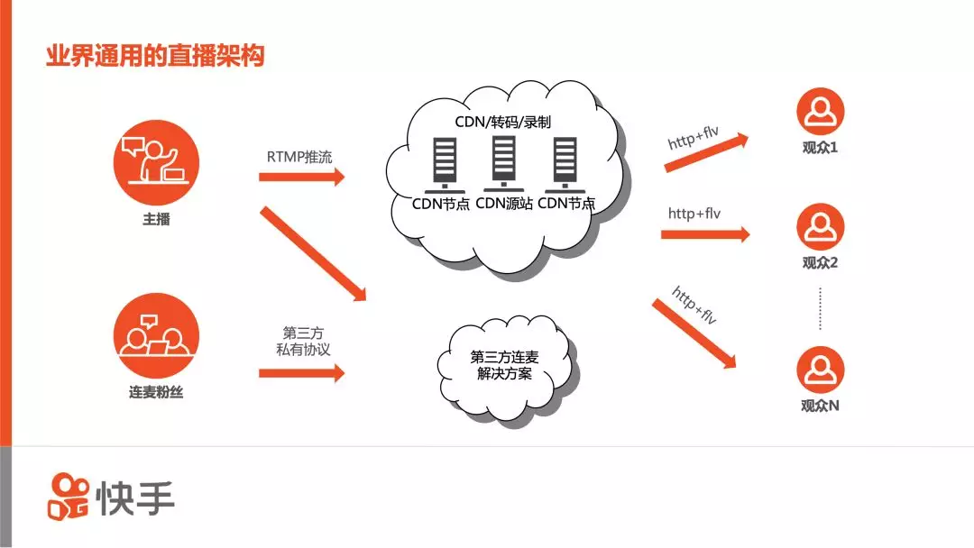 目前业内通用的直播架构都是类似这样的:各家CDN厂商均基于标准的RTMP协议,提供推流、录制、分发等服务。同时一些第三方RTC服务提供商,也会提供连麦和PK的解决方案。站在集成的角度,快手理论上只要把业务集成到第三方标准服务上,同时完成UI、业务层的开发,就可以搭建一套完整的系统,我们一开始也是采用类似的方式满足了业务的基本需求。然而,随着系统规模的扩大,我们对用户体验的要求越来越高,这种方案会存在典型的木桶效应,主要痛点有: