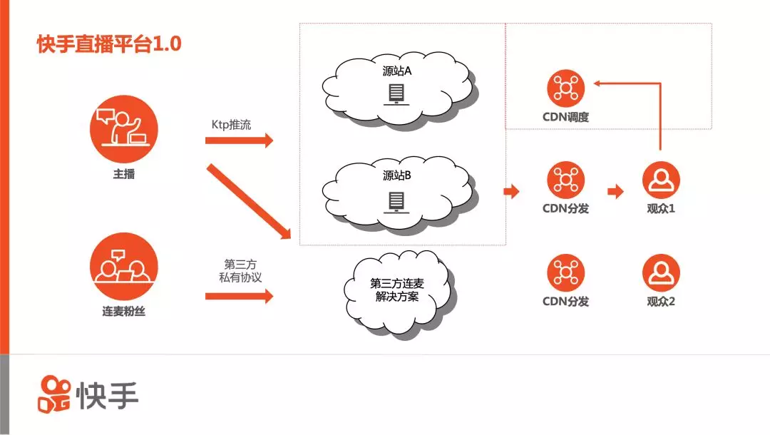 快手直播平台的1.0着重解决两个短板。一个短板是快手无法使用自研的推流协议,在这方面快手自建了源站,用自己的私有协议KTP进行推流。基于自建的源站,快手拥有了CDN调度的能力,这样对容灾和风险的把控就会非常强,解决了第二个短板。