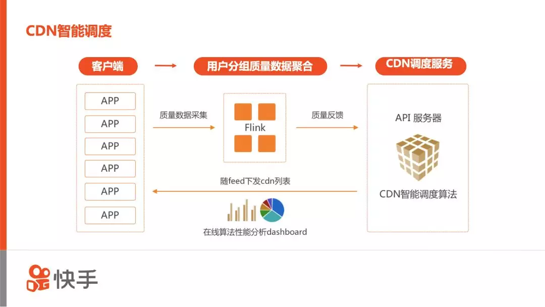 自建源站赋予了快手CDN调度的能力,即各家CDN都需要来快手自建源站进行回源拉流。快手源站通过控制各CDN的流量比例,在质量和成本间取得最好的折衷。然而,快手体量庞大,需要同时使用多家CDN,而各家 CDN 的质量、价格参差不齐,以及经常有一些不可预知的突发状况,因此,通过人工调度的方式,显然是无法接受的。快手通过自研智能CDN调度系统,精确捕捉 CDN 与用户的动态变化,从而更合理地利用CDN 资源,且大大降低观看故障时长,节约大量人力监控和维护成本。