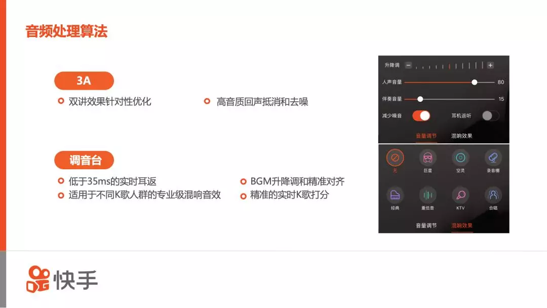 在音频处理上快手除了有自己的3A算法外,还做了针对高音质的回声抵消和去噪。另一方面,快手也具备KTV的功能,全民K歌、唱吧类似的混响效果都完全满足,同时部分效果针对不同K歌人群做了专业级调校的音效。