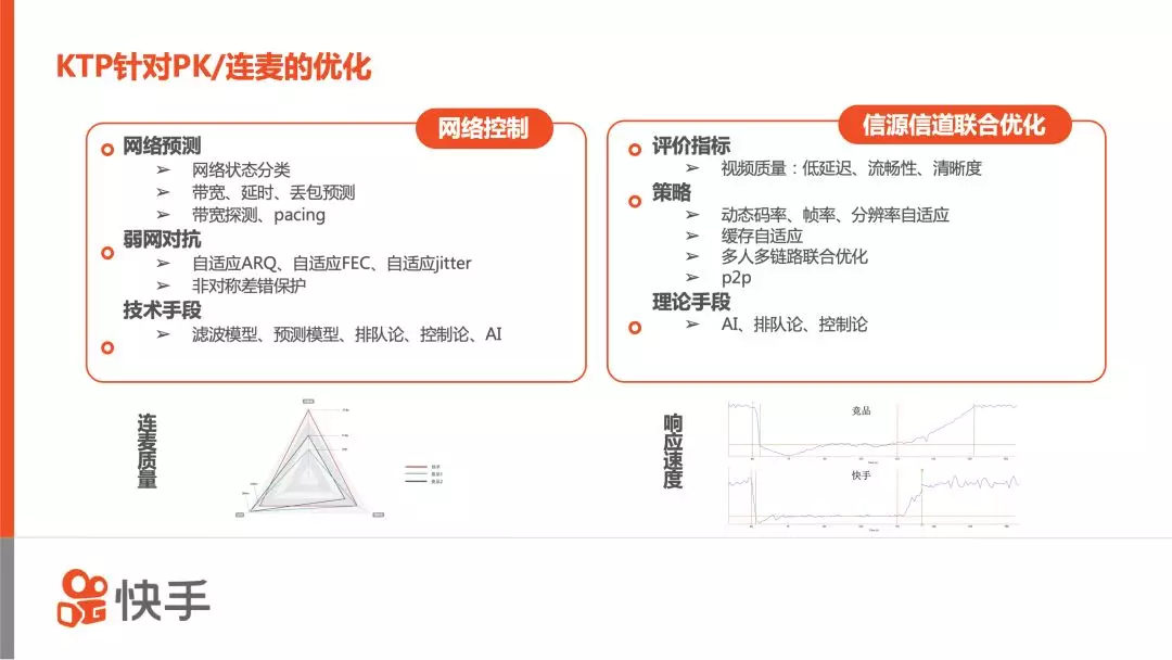 KTP协议是快手自研的传输协议,支持直播推流、RTC实时音视频通信、短视频上传等多种业务。去年快手的周超博士在ArchSummit上有一个详细的分享【快手多媒体传输算法优化实践】。KTP是快手基于UDP的自研传输协议,用于优化快手直播推流、PK/连麦等业务的体验。该协议主要包括网络控制部分和信源信号联合优化部分,包括拥塞控制,视频清晰度、流畅度相关的联合优化,对该协议有兴趣的同学可以参考上述链接的介绍。通过跟各种公开协议的对比PK,无论是RTMP,还是现在比较热的QUIC协议,快手KTP都有诸多明显的优势。