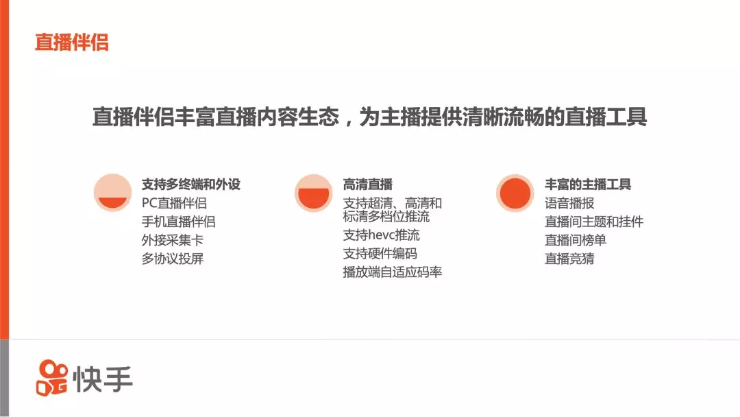 首先介绍的是快手的直播伴侣。直播伴侣支持多终端(PC、iOS、Android),以及多种模式的投屏,支持超清、高清和标清多档位的推流。这些和虎牙、斗鱼等专业的游戏直播比较类似。