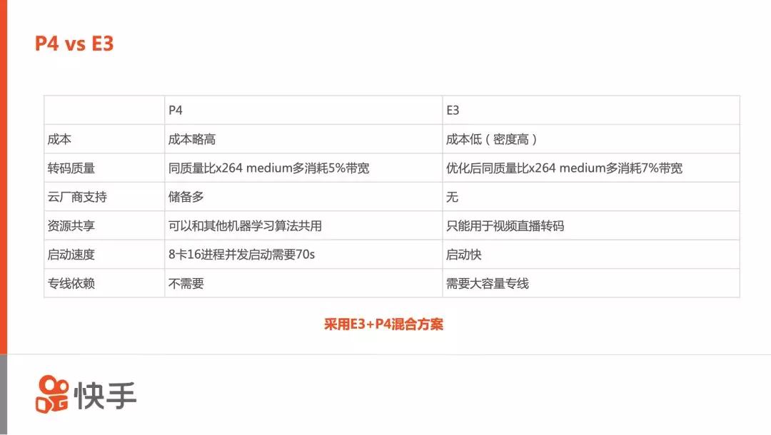 经过多方权衡,快手最终选定了用GPU的方案。这时又面临GPU方案的二选一:Nvidia VS. Intel。在当时,Nvidia的P4和Intel的Xeon E3是两个可选的方案,经过数轮优化后,对比下来,二者转码质量相差并不大。但由于我们的源站建设在云端,云厂商有很多的P4卡储备用于AI计算。而由于E3在云端主要做媒体处理,AI方面用的并不广泛,虽然它成本比较低,但云厂商都是没有储备的。因此我们的P4方案是采用云厂商提供的设备,但E3的方案则需要在自建IDC部署,这样就需要我们的IDC到云厂商有一个大容量的专线,专线的稳定性、容量这些都是需要考虑的因素。经过仔细的评估,快手决定采用E3+P4的混合方案,兼顾质量、成本和稳定性。