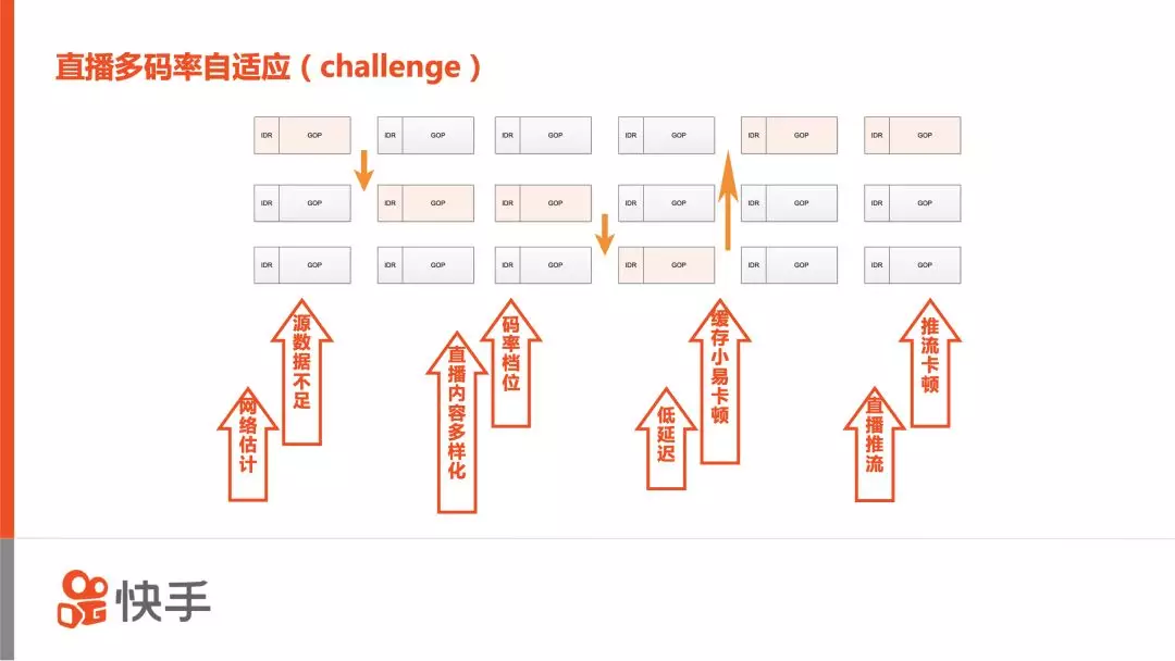 与点播场景不同,直播的多码率面临着很多新的挑战,例如直播流是实时产生的,在带宽估计方面会面临数据不足引起网络空闲导致估不准的问题;为了保证直播的实时性,客户端的缓存一般也比较小,从而对网络的抗抖动能力不如点播场景;此外,快手的直播推流是基于KTP的,支持推流的动态码率、帧率自适应,而这些信息在客户端是不可见的,当客户端发生卡顿时,难以判定是因为推流卡顿还是拉流带宽不足导致。另外,传统的直播多码率自适应是基于HTTP切片分发的方案(如DASH/HLS),主要问题是延时大、国内CDN支持不好、可扩展性差。