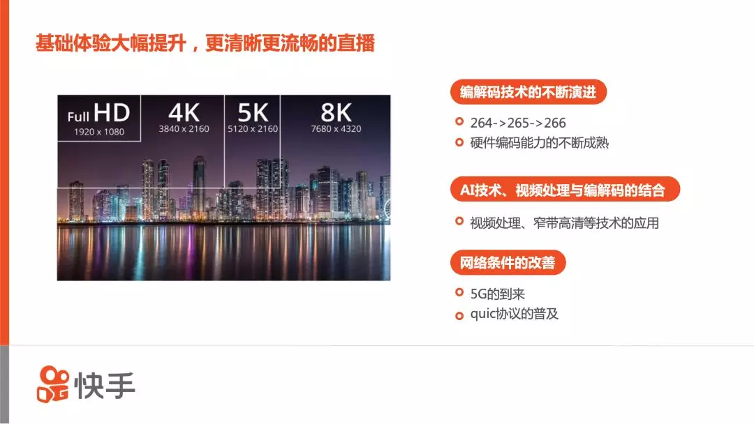 最后简要聊下5G+AI下直播技术趋势,抛砖引玉。在5G网络下,带宽越来越高,延迟越来越低;在硬件基础设施上,机器的算力越来越强,基于AI的各种算法也越来越强大,可以支撑更复杂的算法上线。因此,基础体验会有一个大幅度提升,在快手上将会看到更清晰,更流畅的直播。这一方面源于编解码技术的不断演进,譬如说H264到H265,再到现在正在标准制定阶段的H266;另一方面,AI技术和视频处理以及编解码的结合,让视频主观质量上提升更多;最后是网络条件的改善,包括基础设施的改善以及5G时代的到来,同时更多先进的算法和协议的落地,都将提升直播的体验。