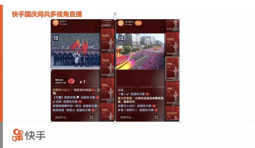 5G的时代,泛在的无线网络可以让人们随时随地看电视。快手也在不断进行这方面的探索。今年的“十一”阅兵,快手进行了7路特殊视角的70小时直播,总观看人次超过十亿。我们让更多的用户透过小屏幕感受国家正在发生的事情,正如我们最新的广告语“在快手,看见真实的中国”。