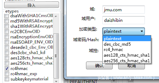 这个地方要注意的是如果在配置里面选择用hash(不是plaintext)的话,hash的加密类型,要跟etype一样。因为KDC是按照etype类型选择用户对应加密方式的hash,如果是选择明文(plaintext),那么client 会按照etype里面的加密方式将明文加密成hash。