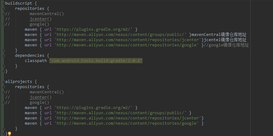 在国内使用jcenter、mavenCentral及google三个远程仓库,GradleSync会很慢,goole仓库甚至需要科学上网才能访问。为了加快Gradle Sync速度,可以优先使用阿里云镜像 仓库作为下载源。