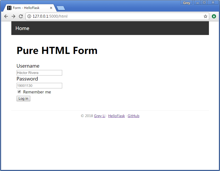这一章一开始给出了一个 HTML 登录表单的示例,示例代码和渲染后的画面(图 4-1)中,用户名输入框的占位文字是 Héctor Rivera,密码输入框的占位文字是 19001130,勾选了记住登录状态的「记住我(Remember me)」选项。